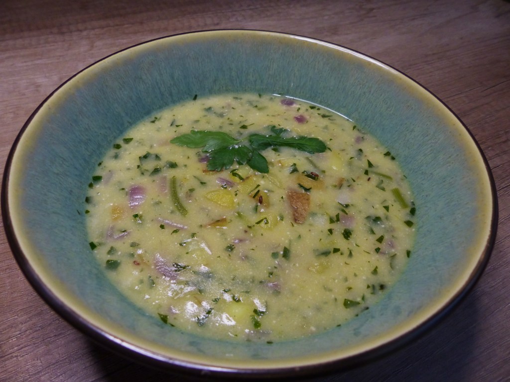 We are talking about Erdäpfel-Petersiliensuppe, or in English: Potato-parsley soup. I found this recipe while making a culinary trip around Austria. It’s a very simple yet clever way of making soup by combining two soup bases together to get the full flavour out of all parts of your ingredients. This clever approach made it a staple in my kitchen and definitely deserving of a spot in this blog.